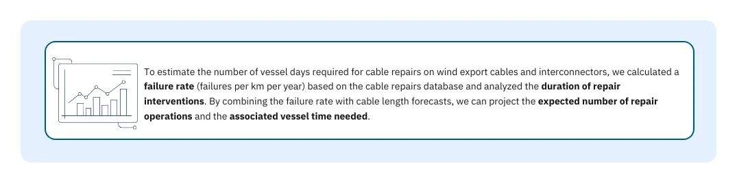 The database gives full access to detailed information on failures, vessel activities, and repair timelines. From the consolidated list of past repair campaigns, key metrics can be analyzed, including failure rates across various factors (such as water depth and cable specifications), repair lead times or average repair durations.