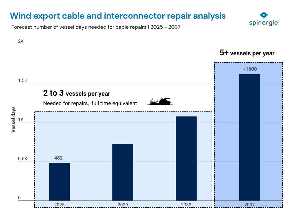 Spinergie forecasting shows that O&M vessel demand (in vessel days) will more than triple between 2025 and 2037—rising from today’s equivalent of two full-time vessels to around five by 2037. This surge reflects the rapid expansion of active subsea cable networks — from 39,000 km in 2025 to 146,000 km by 2035 for wind export cables and interconnectors.