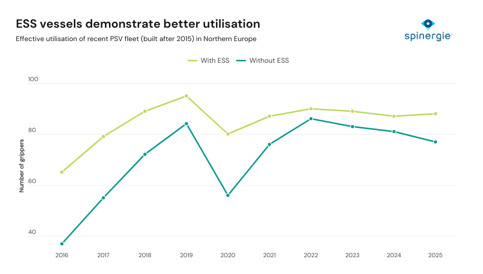 Charterers are prioritising vessels with better fuel efficiency. These more efficient vessels tend to exhibit higher utilisation, longer charter durations, and a greater likelihood of repeat awards. Spinergie Market Intelligence analysis indicates that more efficient vessels display higher utilisation, longer charter durations, and have a greater likelihood of repeat awards. See chart below for analysis.
