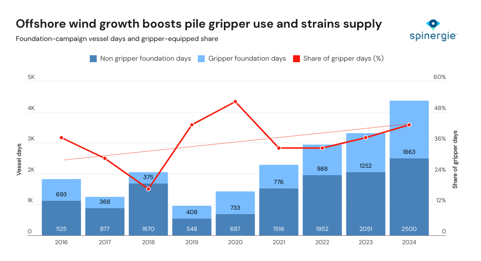 Despite year-to-year volatility, adoption displays an upward trajectory as larger monopiles and tighter installation tolerances increasingly favor vessels fitted with modern grippers. Overall, the rise in gripper-equipped days broadly tracks with the underlying growth in offshore wind demand.