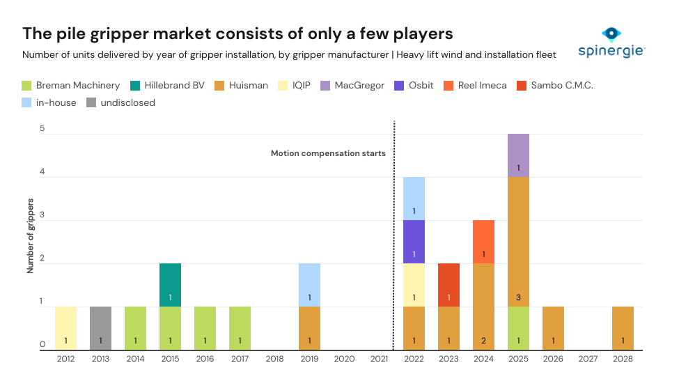 With eight delivered units, and two expected in 2026 and 2028 respectively, Huisman dominates the global pile gripper market—by far the largest share of the existing fleet. Breman Machinery ranks next with five units, primarily through its role as a subcontracted fabricator for TWD-designed grippers.
