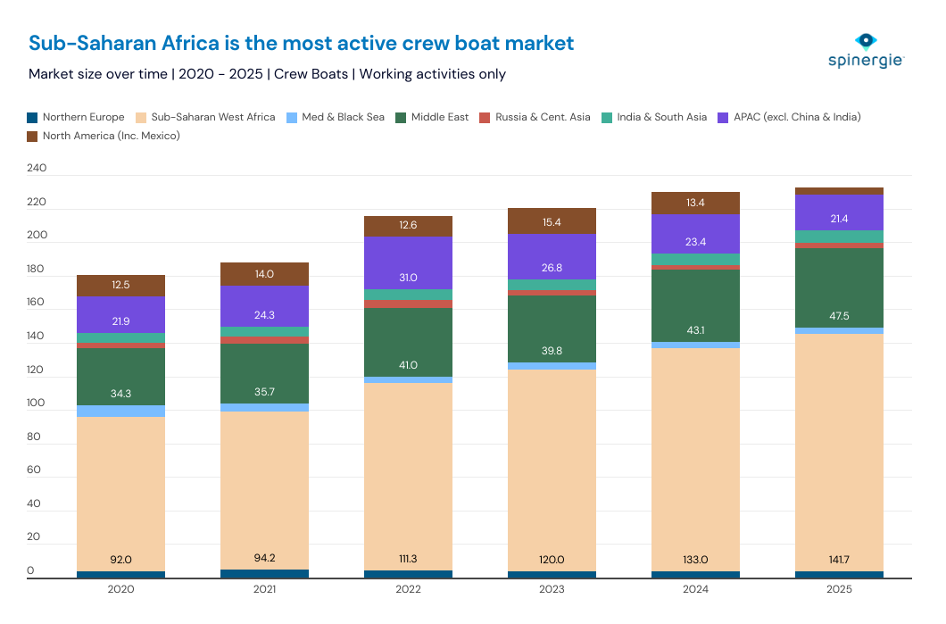 Demand for crew boats follows offshore maintenance and production schedules, which is why operators can rely on consistent activity levels. With their main markets being the Middle East and Sub-Saharan Africa, demand is likely to rise in line with rising developments for each region in the coming years.