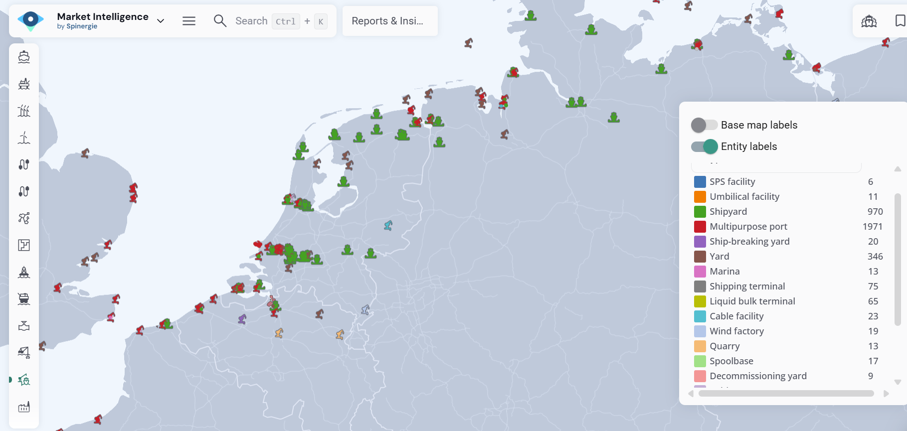 The Live Map shows the ports closest to a project location. Colour-coding indicates headline details about a port, whether it is multipurpose or more specialised—such as a cable facility or wind factory. Switching the legend changes the coding to show the port's status, making it clear which facilities are active and which are still in the planning stage.