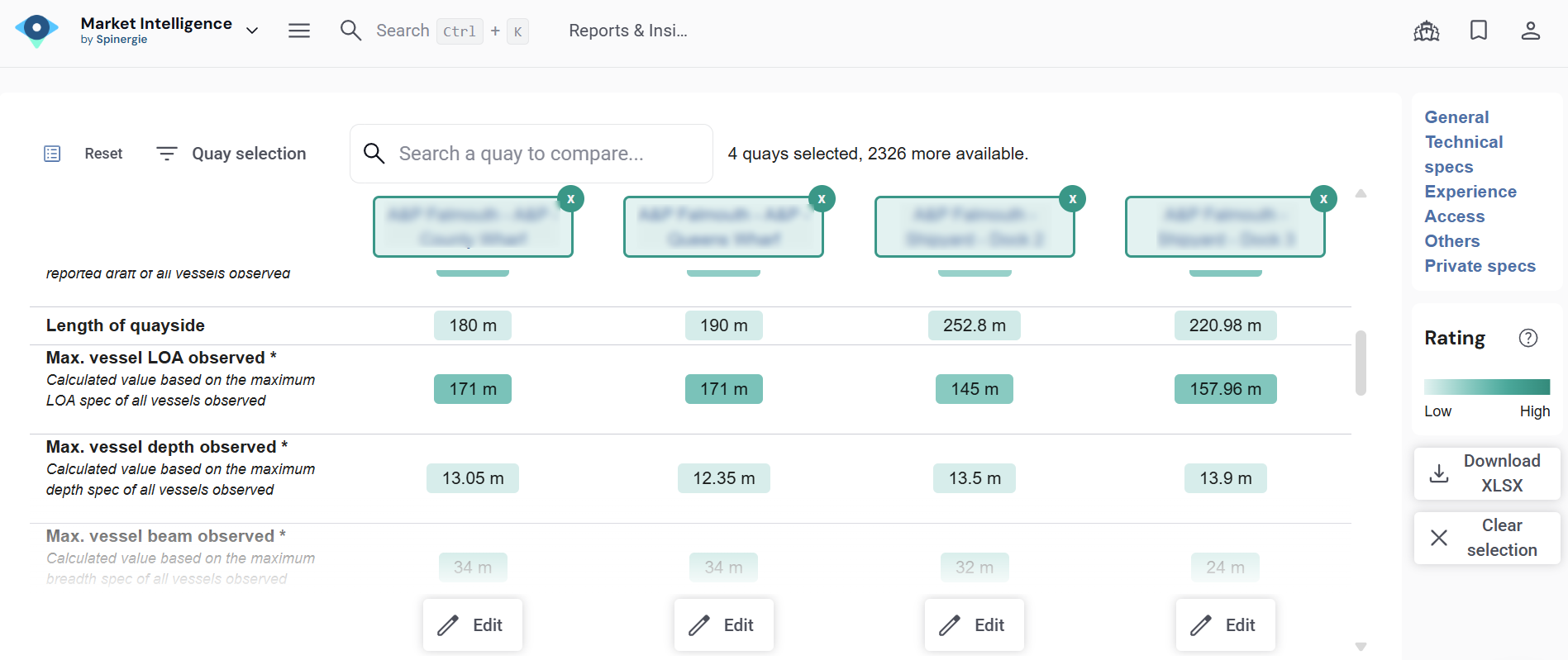 Many Spinergie clients use the initial map layer to compile a shortlist of facilities. This is made easier with advaced filtering for both ports and quays, enabling deeper technical selection before undertaking further analysis.
