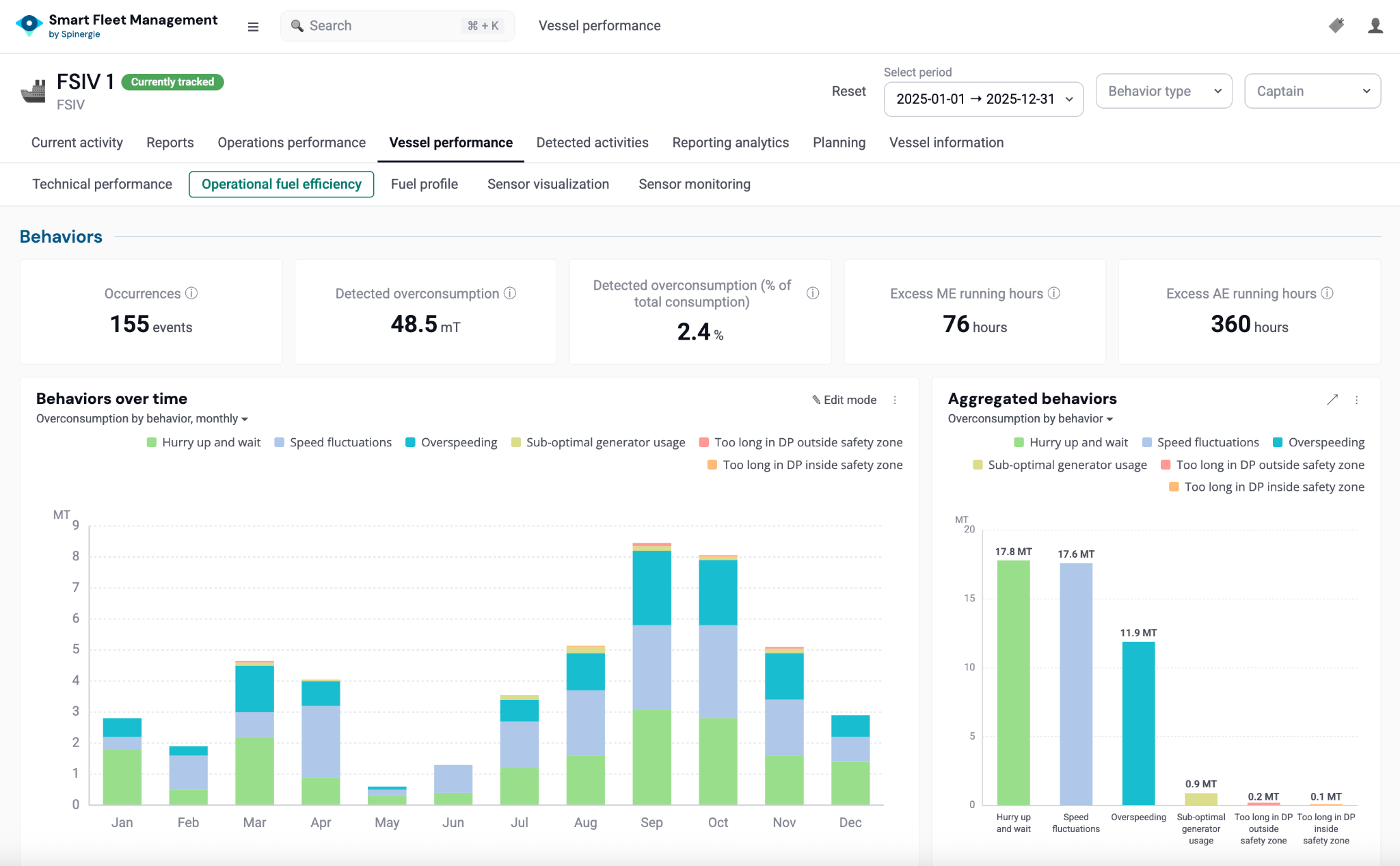 Spinergie uses location data to identify patterns associated with inefficient behaviours. This can be achieved with or without sensors, as the only requirement is a ‘speed-to-fuel’ model to calculate overconsumption. Associated overconsumption (in MT and as a percentage of total consumption), excess main and auxiliary engine running hours, and behaviour counts are then quantified.