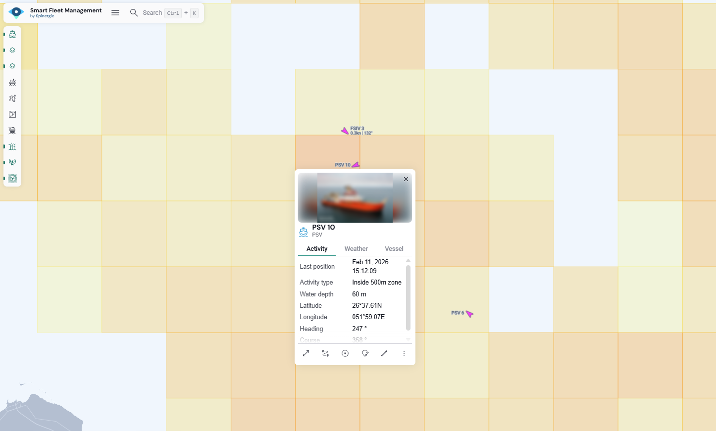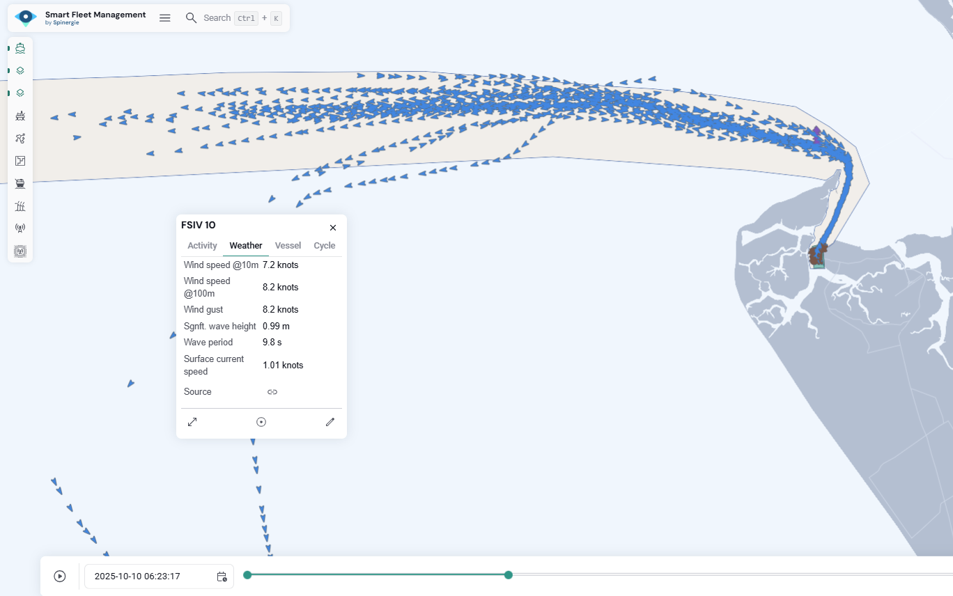 - Weather conditions: Spinergie overlays vessel data and positioning with real-time weather data, including wave height. This was used to determine whether conditions were within the operational safety threshold.